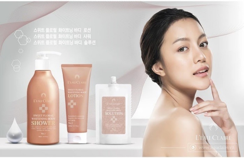 Bộ tắm trắng L’eau claire gồm 3 sản phẩm: Sữa tắm trắng da hương hoa ngọt ngào Floral Whitening Body Shower, Ủ trắng body hương hoa ngọt ngào Sweet Floral Whitening Body Solution và Dưỡng thể trắng da hương hoa ngọt ngào Sweet Floral Whitening Body Lotion