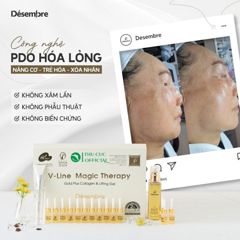Bộ trị liệu Desembre V-Line Magic Therapy là liệu pháp nâng cơ trẻ hóa ứng dụng chỉ PDO trong điều trị chỉnh hình cơ mặt không “dao kéo”, giúp cải thiện làn da chảy xệ bằng cơ chế thâm nhập sâu vào các tế bào để tăng độ đàn hồi, săn chắc cơ mặt. Với tính chất tuần hoàn liên tục, V-Line Magic Therapy giúp kích thích tái tạo tế bào trên da, lưu thông hạch bạch huyết mang đến hiệu quả: