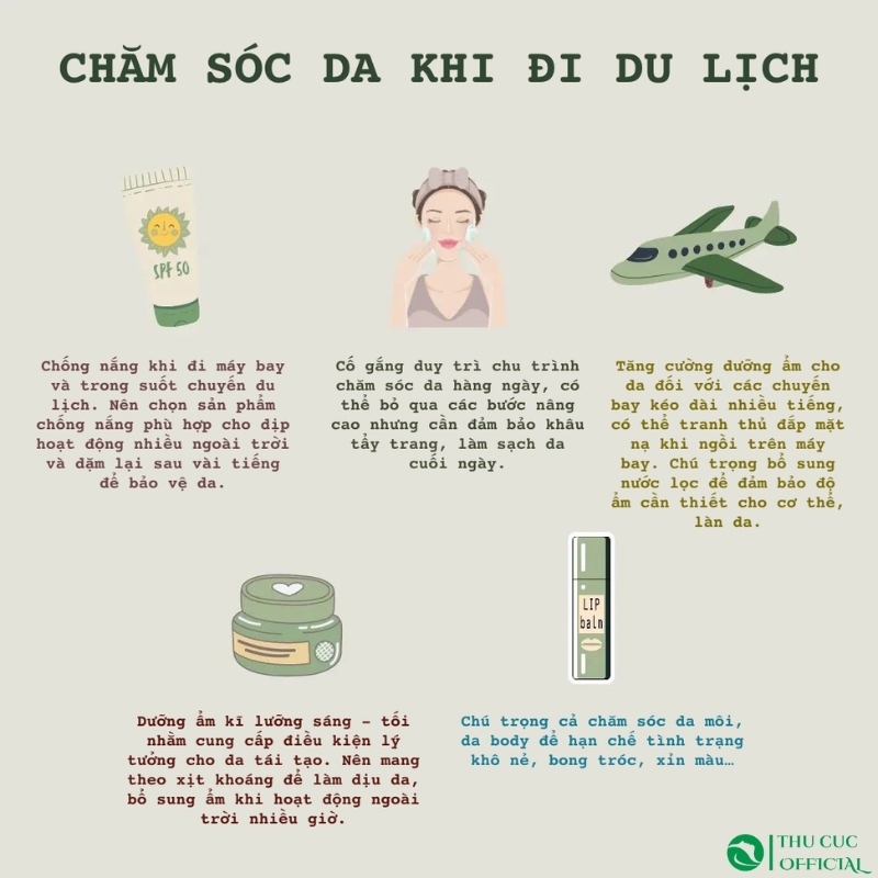 Du lịch, hay đi biển là khoảng thời gian bạn được “xả hơi” sau những ngày dài bận rộn. Tuy nhiên, không khí khô hanh, ánh nắng gắt, nước biển mặn và lịch trình dày đặc dễ khiến làn da mất nước, cháy nắng, nổi mụn hoặc xỉn màu. Tham khảo ngay bí quyết chăm sóc da khi đi du lịch, đi biển được Mỹ Phẩm Thu Cúc tổng hợp dưới đây.
