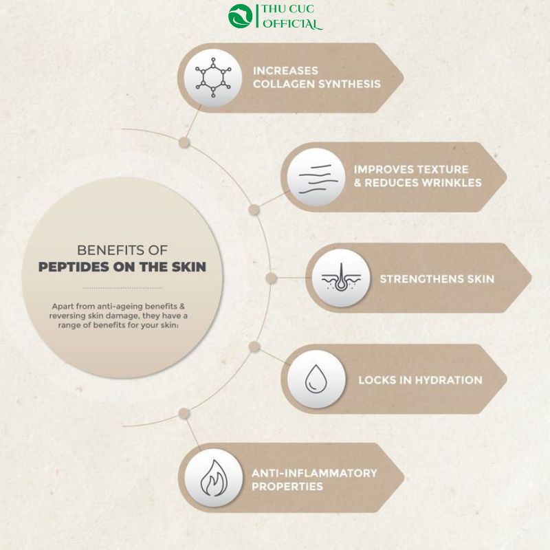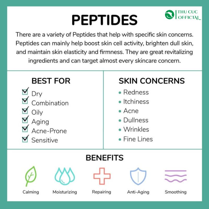 Peptide: Là các chuỗi ngắn của axit amin, giúp kích thích sản sinh collagen tự nhiên, cải thiện độ đàn hồi và giảm nếp nhăn cho da.