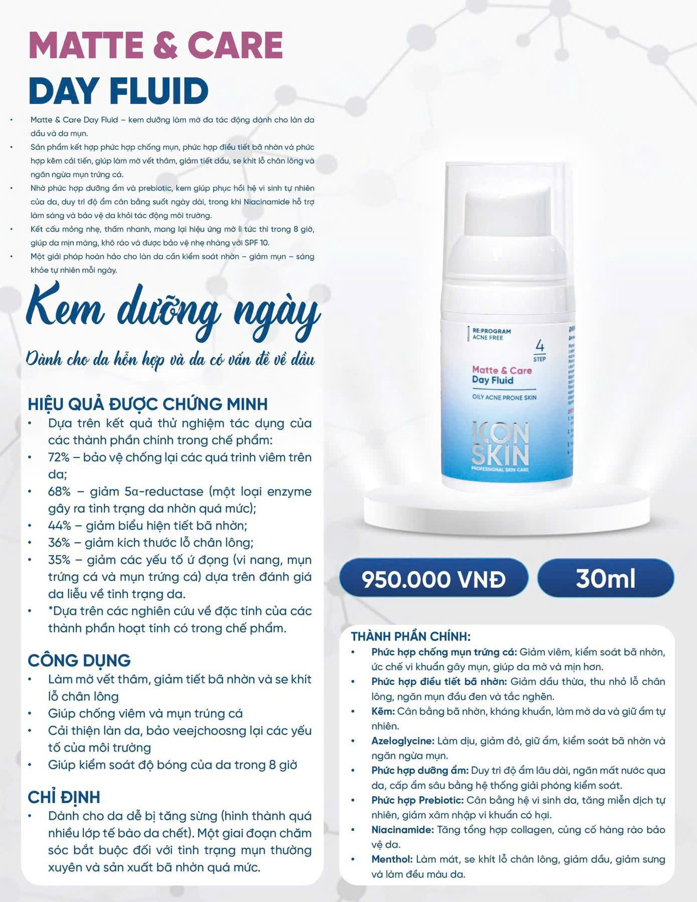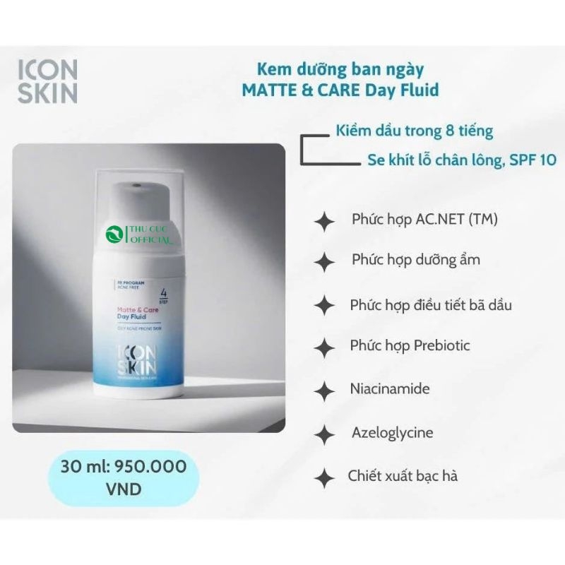 Bạn đang tìm một loại kem dưỡng ban ngày không gây bí da, kiểm soát dầu hiệu quả, lại an toàn cho da mụn? Kem dưỡng ban ngày ICON SKIN Matte & Care Day Fluid chính là lựa chọn chuyên biệt dành cho làn da dầu, da mụn và da nhạy cảm.