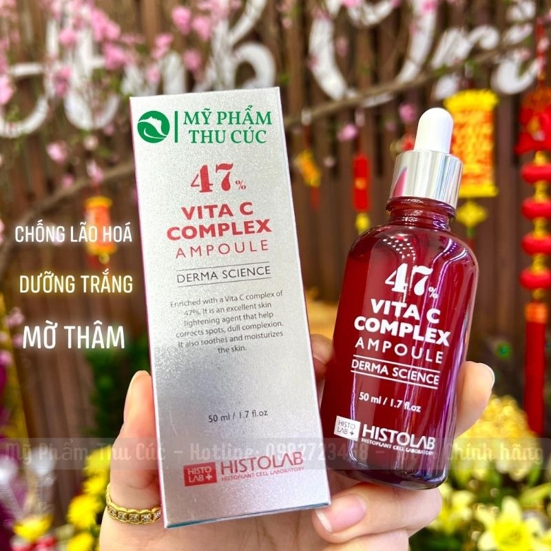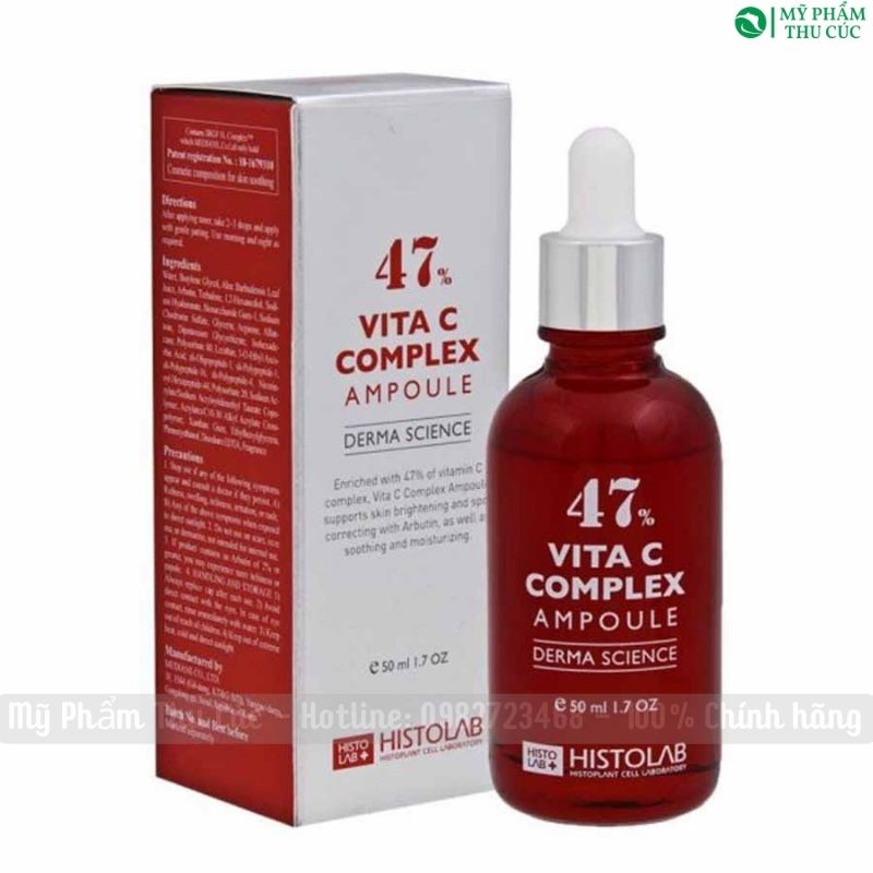 Histolab 47% Vita C Complex Ampoule Derma Science là sản phẩm có chứa 47% phức hợp Vitamin C (nồng độ khá cao) nên được đánh giá là dòng sản phẩm dưỡng trắng tốt.