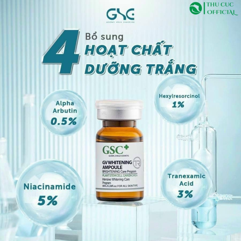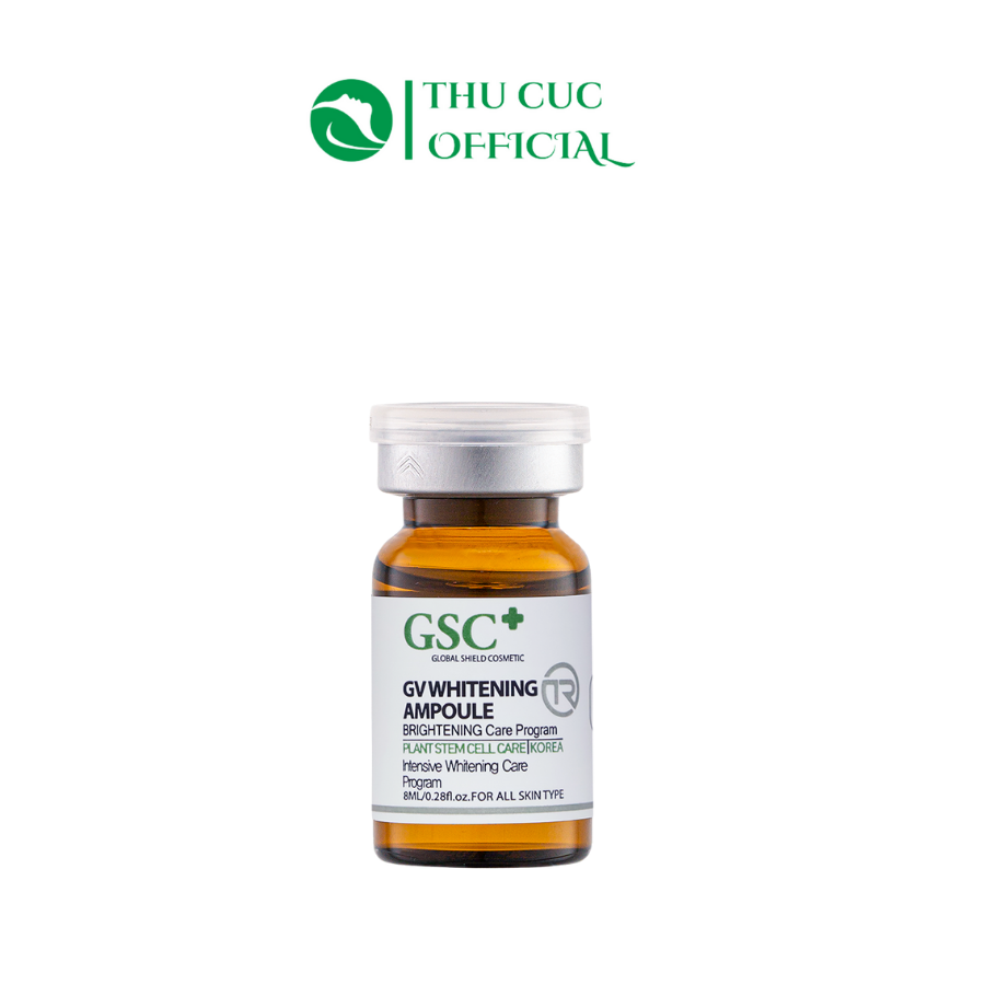 Tế bào gốc làm trắng da GSC Whitening Ampoul thuộc dòng mỹ phẩm cho spa giúp loại bỏ nám tận gốc, dưỡng chất, axit amin làm đẹp da, cho làn da sáng mịn, đồng đều màu da.