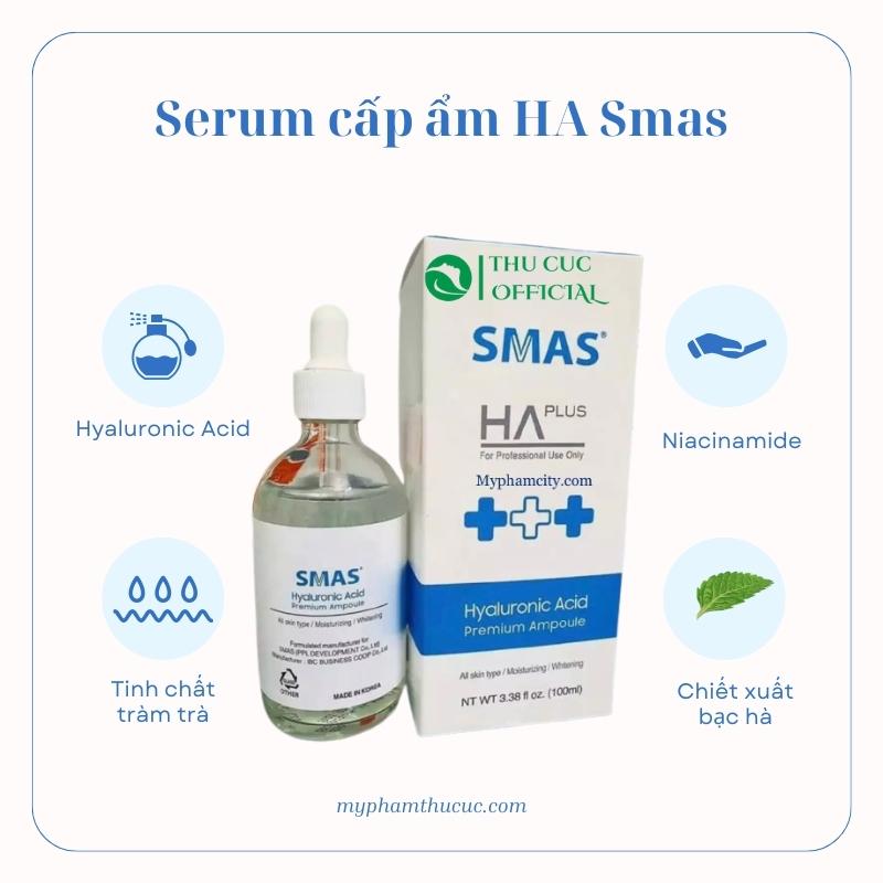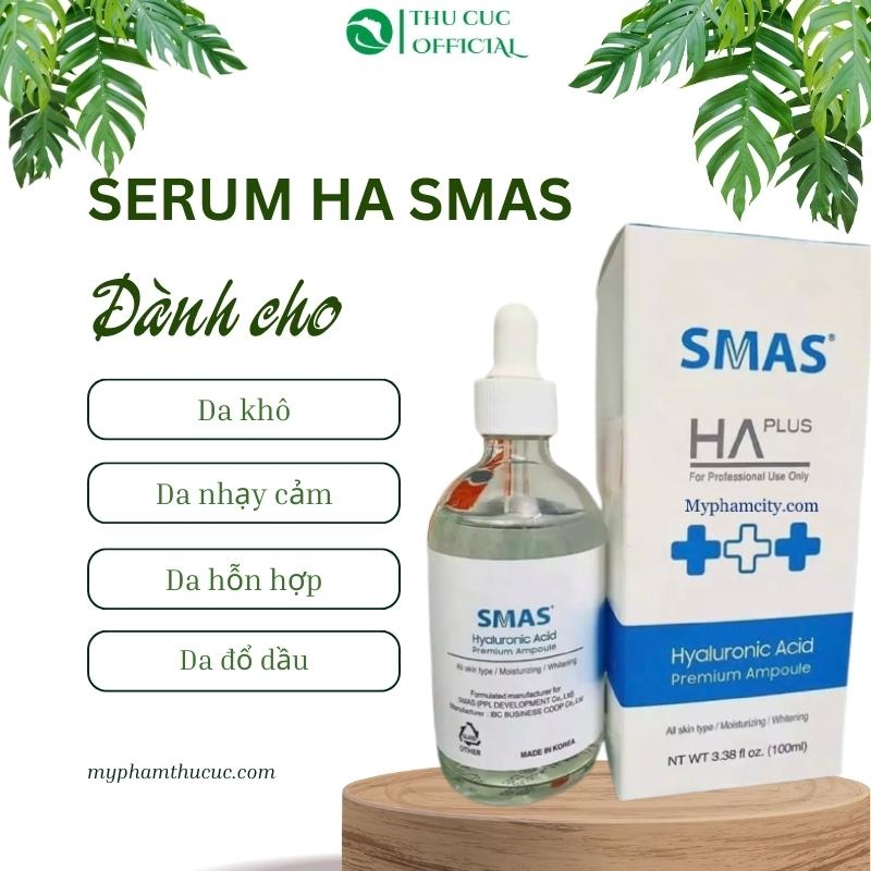 Tinh chất Serum HA SMAS 100ML thẩm thấu sâu vào da, cấp nước, dưỡng ẩm tối đa cho làn da tươi trẻ, mịn màng. Sản phẩm được nhập khẩu và phân phối hính hãng bởi Thu Cúc Official.