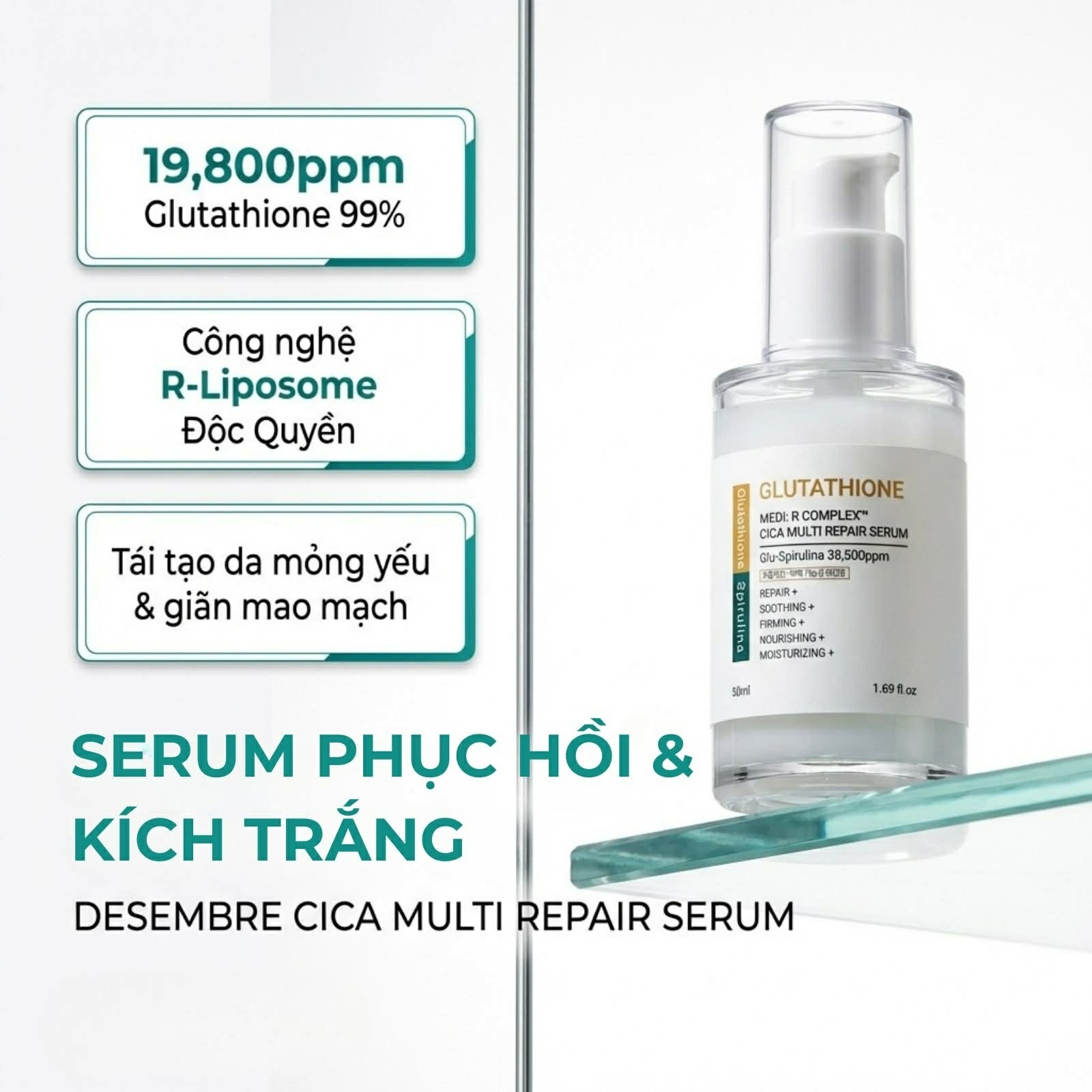Với công thức độc quyền từ Désembre, Glutathione Medi:R Complex Cica Multi Repair Serum được các spa tin dùng trong các liệu trình như peel, laser, phi kim nhờ khả năng phục hồi nhanh và an toàn cho da nhạy cảm.