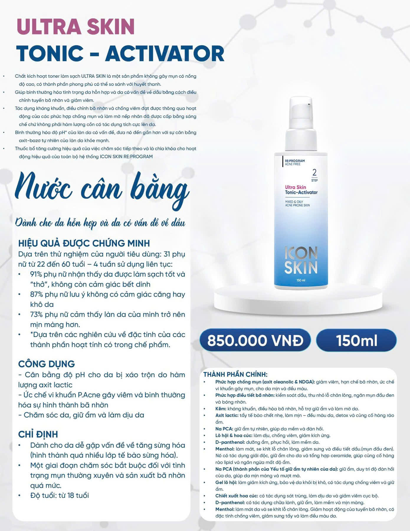 Toner ICON SKIN – Ultra Skin Tonic-Activator là bước thứ 2 trong chu trình chăm sóc da mụn theo chuẩn y khoa từ thương hiệu ICON SKIN – Hàn Quốc. Sản phẩm đóng vai trò như một "kích hoạt tố" giúp cân bằng pH, làm dịu da, kiểm soát dầu thừa và tăng khả năng hấp thụ dưỡng chất cho các bước chăm sóc tiếp theo.