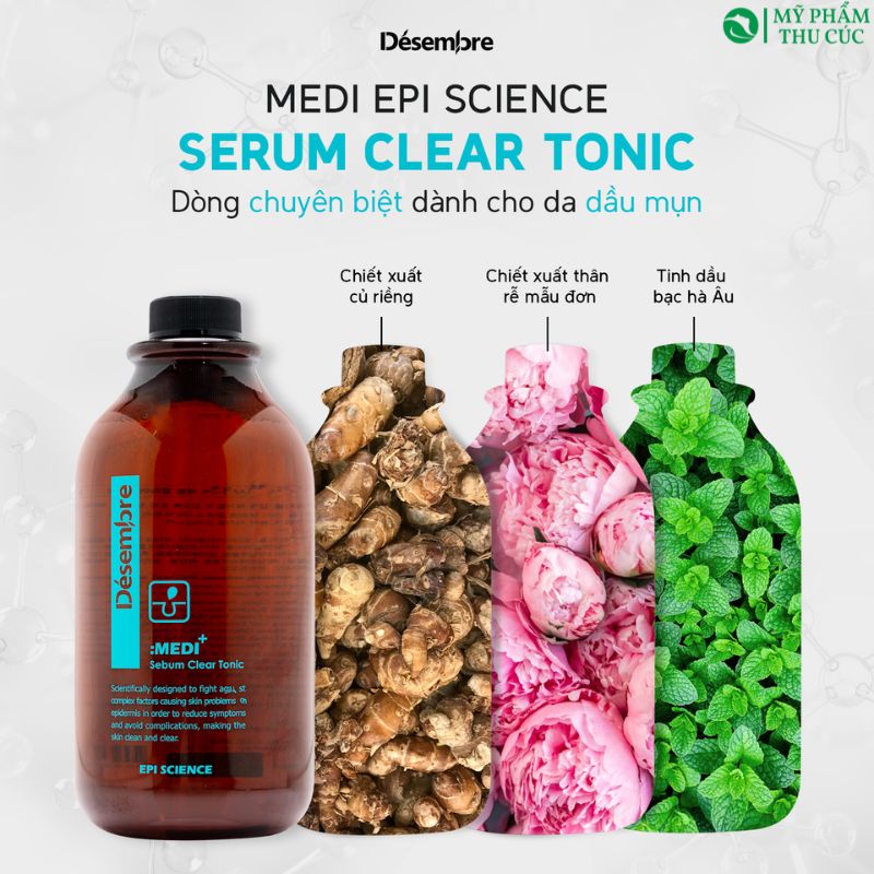 Ủ bã nhờn Desembre Medi Epi science P.skin Care Clear Tonic với thành phần chính là 12 loại thảo dược nổi bật là chiết xuất từ củ riềng, chiết xuất thân, rễ mẫu đơn. Trong đó: