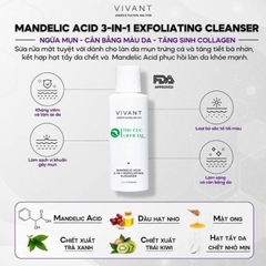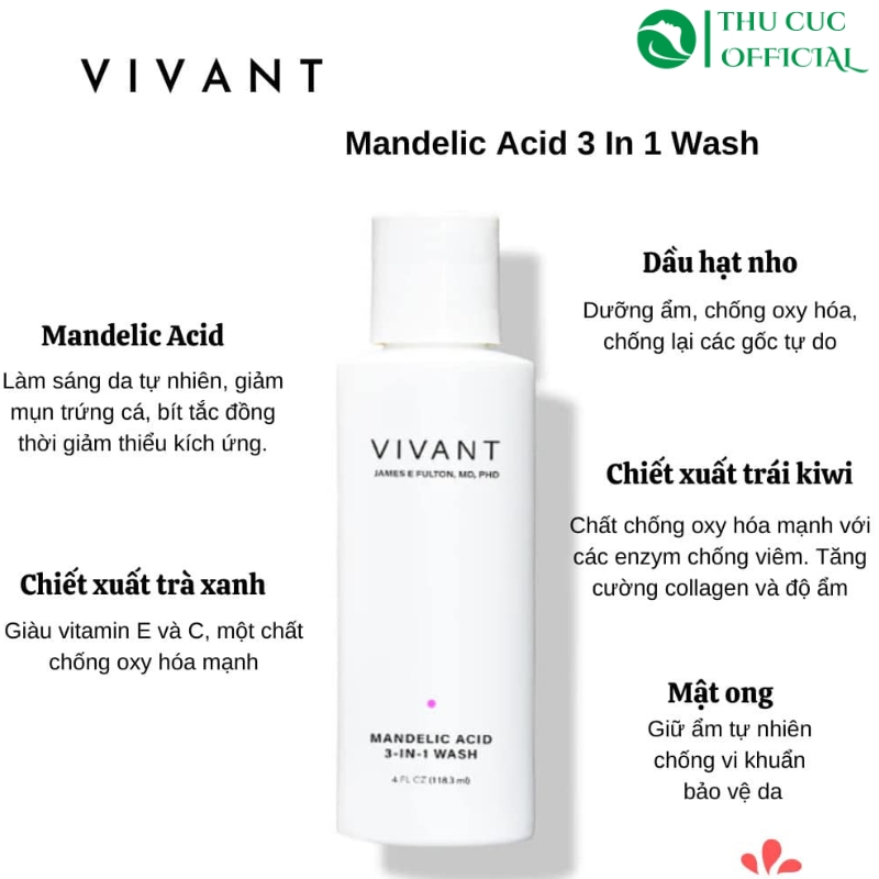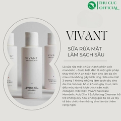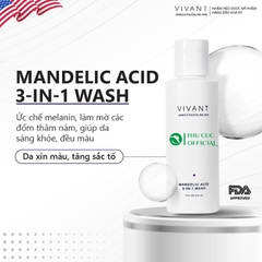 Sữa rửa mặt Vivant Mandelic Acid 3-in-1 Wash làm sạch sâu với Mandelic Acid cùng các chất oxy hóa tự nhiên giúp chữa lành làn da, ngăn ngừa gốc tự do, làm mờ các sắc tố dư thừa, phục hồi làn da đều màu, căng bóng.